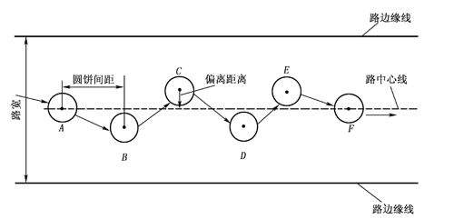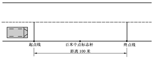 尺寸: (1)路宽:7米; (2)圆饼直径:70厘米,B、C、D、E圆饼中心点偏离路中心线1米; (3)饼高:小于车辆最小离地间隙;小型车辆6厘米,其他车辆10厘米; (4)圆饼间距:指相邻两块圆饼中心点投影在路中心线上之间的距离;大型客车、城市公交车、大型货车所考核的圆饼间距为2倍车辆最前轮轴至最后轮轴距,牵引车圆饼间距为1.5倍轴距(轴距是牵引车前轴至挂车最后轴的轴距),其他汽车圆饼间距为2.5倍的车辆轴距。 圆饼数量:牵引车只设A、B、C三个圆饼,其他车辆设置六个圆饼。 2、操作要求 除小型车辆用一挡外,其他车辆用二挡(含)以上挡位,将车骑于圆饼之上通过,车轮不得碰、擦、轧圆饼,并且不得超、轧两侧路边缘线。 九、百米加减挡 目的:考核机动车驾驶人操纵车辆挡位的熟练程度。 1、图形设计